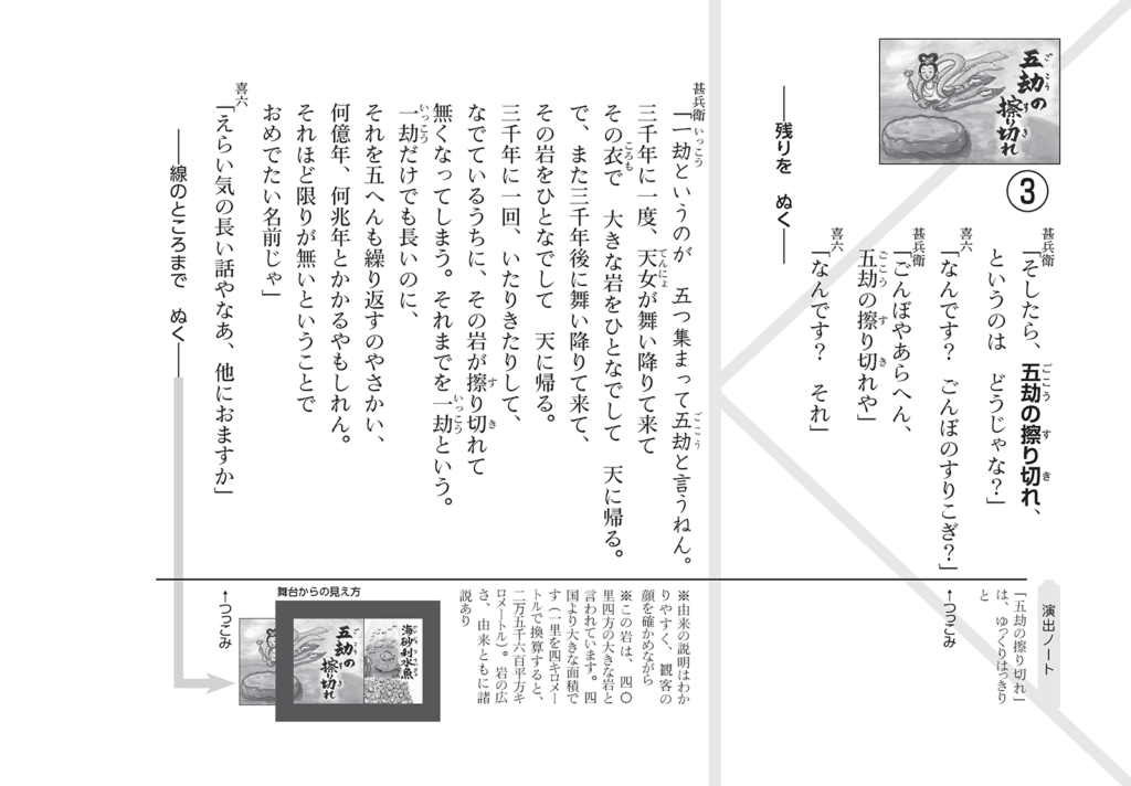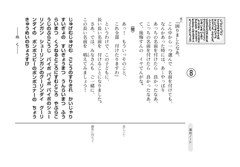寿限無の楽しみ方】 子どもでも知っている有名な落語です。落語家さんによってもストーリーや名前の言い方が若干違うところもあるかと思います。この作品は上方(関西方面)の落語家さんの落語を参考に脚本化しました。全編大阪弁ですが、地元の言葉で語っていただいても構いません。その方が自然に出てくるかと思います。