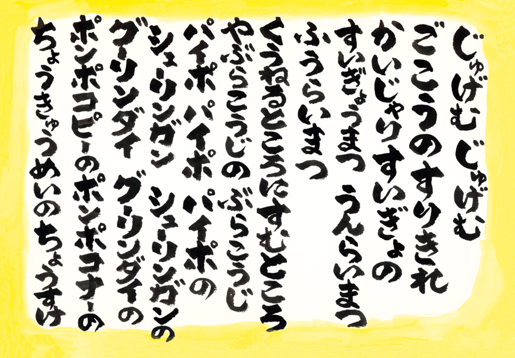 「寿限無」から始まる長い名前を、一緒に読み上げたり、演じ手が面白おかしく読み上げたりと、アレンジしながら楽しめる言葉遊び紙芝居。