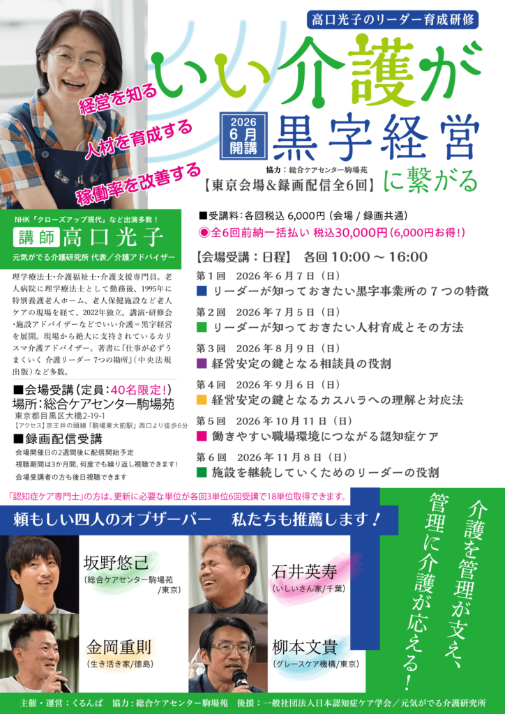 「認知症ケア専門士」の方は、更新に必要な単位が各回3単位6回受講で18単位取得できます。 【会 場】 総合ケアセンター駒場苑 会場受講者40名限定! 東京都目黒区大橋2-19-1 【アクセス】京王井の頭線 「駒場東大前駅」 西口より徒歩6分 【時 間】 各回10:00~16:00 【受講料】 会場受講/オンデマンド(録画)配信共通 各回税込6,000円 ◉全6回前納一括払い 税込30,000円(6,000円お得!) 【講 師】 高口光子(元気がでる介護研究所 代表) 【主 催】 くるんば 【後 援】 一般社団法人日本認知症ケア学会/元気がでる介護研究所 【協 力】 総合ケアセンター駒場苑 【申込先】 くるんば 【オンデマンド(録画)配信】(詳細はオンデマンド配信ページをご覧ください) 開催日より14日後に配信開始予定(視聴期間は3か月間) 動画編集の都合上、配信開始日が数日遅れることもございます。あらかじめご了承ください。 *配信開始日以降のお申し込みも随時受け付けています。お支払い後「入金確認/配信手続き完了のお知らせ」をお送りいたします。視聴期間はお知らせ時点より3か月となります。 *オンデマンド(録画)配信は内容(著作権や個人情報など)によって、カットされる箇所が出ることもあります。 あらかじめご了承ください。 *動画は視聴しやすいよう数コマに分かれています。 *オンデマンド(録画)配信ですのでスマホ・タブレット・PCで、観たい時、いつでもどこでも何度でも気軽に視聴できます! *会場受講の方も後日オンデマンド(録画)配信を視聴できます。 (全6回一括受講の方は、全ての講義を2027年3月31日まで視聴できます)