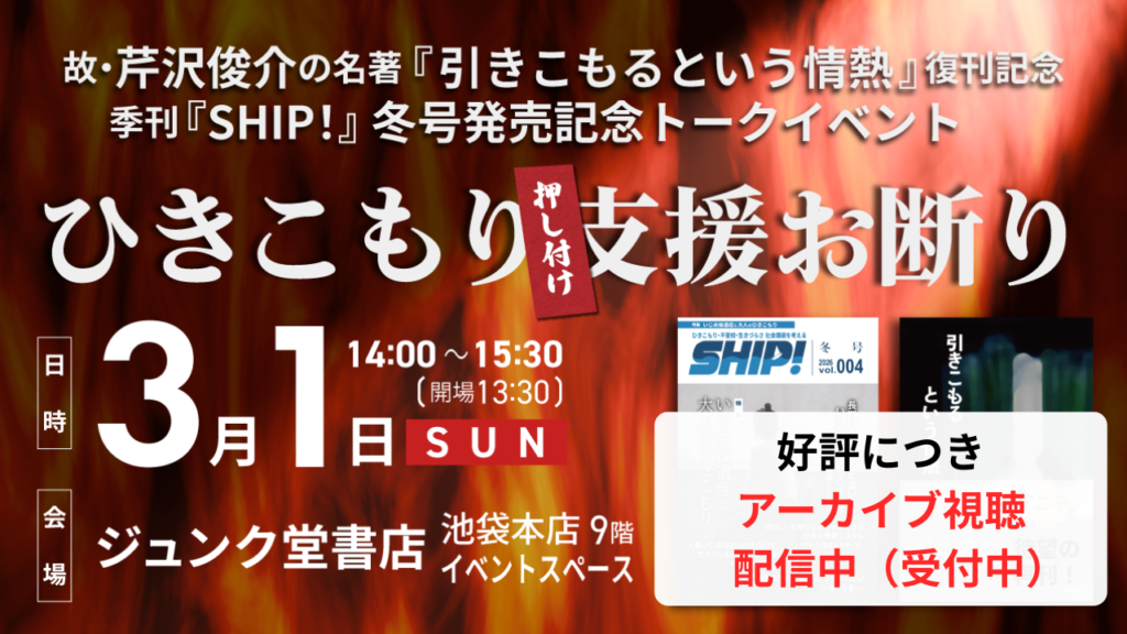 故・芹沢俊介氏の名著『引きこもるという情熱』復刊記念 季刊『SHIP!』冬号発売記念トークイベント – 一...
