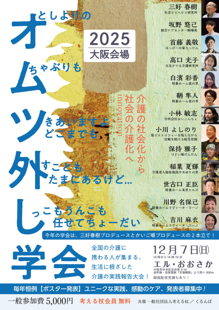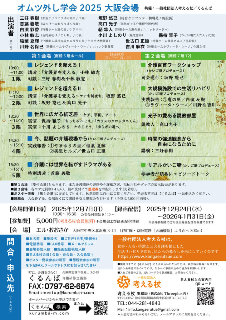 全国の介護に携わる人が集まる、生活に根ざした介護の実践報告大会! 【日 時】 2025年12月7日(日) 10:00~16:00 *受付9:10~(第1会場/南館5階南ホールにて受付) 【会 場】 エル・おおさか 大阪市中央区北浜東3-14 【アクセス】 谷町線・京阪電鉄「天満橋駅」より西へ300m 【受講料】 一般5,000円(税込) 考える杖会員 無料 【出 演】 三好 春樹(生活とリハビリけ研究所/代表) 坂野 悠己(総合ケアセンター駒場苑/施設長) 首藤 義敬(はっぴーの家ろっけん代表) 高口 光子(元気がでる介護研究所代表) 白濱 彩香(特養ホーム恵の里/ケアマネ) 鞆 隼人(特養ホーム恵の里/ユニットリーダー) 小林 敏志(合同会社はいこんちょ/代表) 小川 よしのり(筋ジストロフィーを抱えながら活動を続ける絵芝居師) 保持 雅子(つどい場だんだん/代表) 稲葉 夏輝(介護老人福祉施設やまゆりの里/主任生活相談員) 世古口 正臣(特養ホーム美里ヒルズ/施設長) 川野 名保己(特養ホームラヴィータ・ウーノ/リハレク委員長) 吉川 麻衣(特養ホームラヴィータ・ウーノ/介護主任) 【共 催】 一般社団法人考える杖/くるんば 【申込先】 くるんば 【録画配信受講】 視聴期間:2025年12月24日〜2026年1月31日 *2025年12月24日以降のお申込みの方の視聴期間は入金確認後より3か月となります。 *録画配信は内容(著作権や個人情報など)によって、カットされる箇所が出ることもあります。 あらかじめご了承ください。 *動画は視聴しやすいよう数コマに分かれています。 *録画配信ですのでスマホ・タブレット・PCで、観たい時、いつでもどこでも何度でも気軽に視聴できます! *会場受講の方も後日録画配信を視聴できます。 *考える杖会員の方は専用Youtubeチャンネルにて無料で視聴できます ******************************************************************************************* プログラム 第1会場(南館5階 南ホール) 【1限】レジェンドを超えるⅠ(10:00 〜11:00) 講演:「介護界を変える」小林 敏志 対談:三好 春樹&小林 敏志【2限】レジェンドを超えるⅡ(11:10〜12:00) 講演:「介護界を変える〜ケアも制度も」坂野 悠己 対談:坂野 悠己&高口 光子