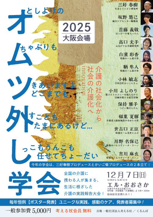 ■ 生活リハビリ講座2025全6回【大阪会場&ライブ配信&録画配信】 【人間学的認知症介護論】 【日 時】 前期1回:2025年5月11日(日) 10:30~15:30 前期2回:2025年6月22日(日) 10:30~15:30 前期3回:2025年8月10日(日) 10:30~15:30 後期4回:2025年9月7日(日) 10:30~15:30 後期5回:2025年10月12日(日) 10:30~15:30 後期6回:2025年11月9日(日) 10:30~15:30 【会 場】国労大阪会館 【ライブ配信】Zoomによる配信 【録画配信】開催日より14日後に配信開始予定 (視聴期間は3か月間) 会場・ライブ配信・録画配信共通 【受講料 全6回】 29,000円(税込) 考える杖会員税込27,000円(税込) 【受講料 前期3回】 15,000円(税込) 考える杖会員税込14,000円(税込) 【受講料 後期3回】 15,000円(税込) 考える杖会員税込14,000円(税込) 【受講料 各回】 6,000円(税込) 考える杖会員税込5,000円(税込) お得な参加費いっしょ割! 2人以上受講一緒で! おひとり様 各回500円(税込)割引! 全5回受講者には特典動画付き! 【支払い方法】 当日現金・事前銀行振込 【講 師】 三好春樹三好春樹(生活とリハビリ研究所代表) 【主 催】 くるんば 【後 援】 一般社団法人日本認知症ケア学会/一般社団法人考える杖/生活とリハビリ研究所 【特記事項】認知症ケア専門士の方は更新に必要な単位が各回3単位、合計18単位取得できます! * 詳細はココをクリック!