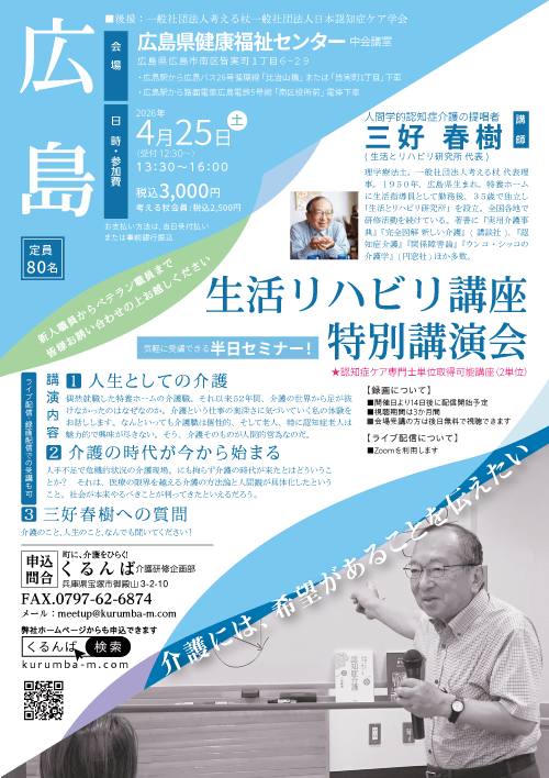 ■ 生活リハビリ講座特別講演会【広島会場&ライブ配信&オンデマンド配信】 【日 時】 2026年4月25日(土) 13:30~16:00 【会 場】 広島県健康福祉センター 【受講料】 一般 3,000円(税込)考える杖会員2,500円(税込) 【支払い方法】 当日現金・事前銀行振込 【講 師】 三好 春樹 【後 援】 一般社団法人考える杖/一般社団法人日本認知症ケア学会 【特記事項】認知症ケア専門士の方は更新に必要な単位が2単位取得できます! * 詳細はココをクリック!