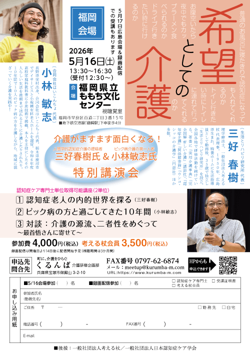 ■ 希望としての介護三好春樹氏&小林敏志氏特別講演会【福岡会場&オンデマンド配信】 【日 時】 2026年5月16日(土) 13:30~16:30 【会 場】 福岡県立ももち文化センター 【受講料】 一般 4,000円(税込) 考える杖会員3,500円(税込) 【支払い方法】 当日現金・事前銀行振込 【講 師】三好 春樹/小林 敏志 【主 催】 くるんば 【後 援】 一般社団法人日本認知症ケア学会/一般社団法人考える杖 【特記事項】認知症ケア専門士の方は更新に必要な単位が2単位取得できます! * 詳細はココをクリック!