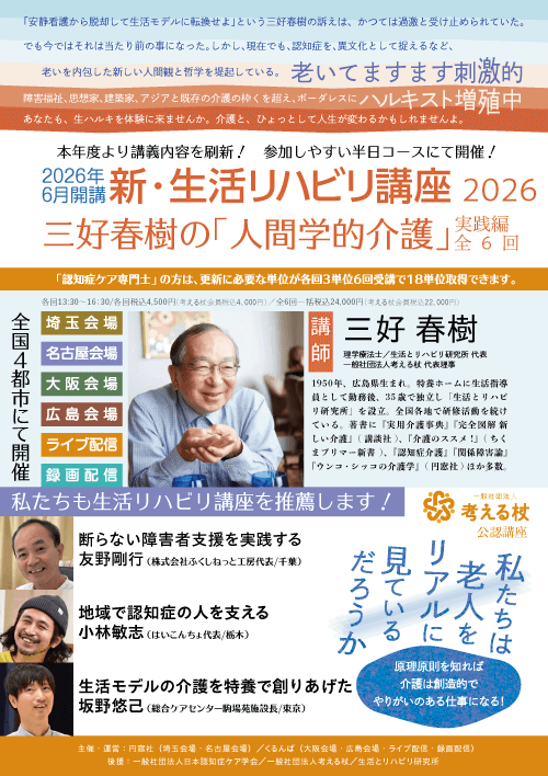 ■ 新・生活リハビリ講座2026【大阪会場&広島会場&ライブ配信&オンデマンド配信】 三好春樹の「人間学的介護」実践編 全6回 本年度より講義内容を刷新! 参加しやすい半日コースにて開催!(2026年6月開講) ◼️第1回:広島会場6月27日(土)/大阪会場6月28日(日) 13:30〜16:30 ◼️第2回:広島会場7月25日(土)/大阪会場7月26日(日) 13:30〜16:30 ◼️第3回:広島会場8月22日(土)/大阪会場8月23日(日) 13:30〜16:30 ◼️第4回:広島会場9月26日(土)/大阪会場9月27日(日) 13:30〜16:30 ◼️第5回:広島会場10月24日(土)/大阪会場10月25日(日) 13:30〜16:30 ◼️第6回:広島会場11月28日(土)/大阪会場11月29日(日) 13:30〜16:30 【受講料 全6回一括】 24,000円(税込)考える杖会員2,200円(税込) 【受講料 各回】 4,500円(税込)考える杖会員4,000円(税込) 【支払い方法】 当日現金・銀行振込 【講 師】 三好春樹(生活とリハビリ研究所代表) 【後 援】 一般社団法人日本認知症ケア学会/一般社団法人考える杖/生活とリハビリ研究所 【主 催】 くるんば 【共 催】 なるほどケア塾(円窓社)*埼玉会場/名古屋会場はなるほどケア塾主催です。 【特記事項】 認知症ケア専門士の方は更新に必要な単位が各回3単位、合計18単位取得できます! 【ライブ配信】広島会場、大阪会場それぞれの日時にて開催いたします。 【オンデマンド配信】各講義の2週間後に配信開始予定(視聴期間は3か月間) *広島会場/大阪会場/ライブ配信受講の方も後日オンデマンド配信を視聴できます。 * 詳細はココをクリック!