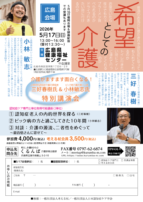■ 希望としての介護三好春樹氏&小林敏志氏特別講演会【広島会場&オンデマンド配信】 【日 時】 2026年5月17日(日) 13:00~16:00 【会 場】 広島県健康福祉センター 【受講料】 一般 4,000円(税込) 考える杖会員3,500円(税込) 【支払い方法】 当日現金・事前銀行振込 【講 師】三好 春樹/小林 敏志 【主 催】 くるんば 【後 援】 一般社団法人日本認知症ケア学会/一般社団法人考える杖 【特記事項】認知症ケア専門士の方は更新に必要な単位が2単位取得できます! * 詳細はココをクリック!