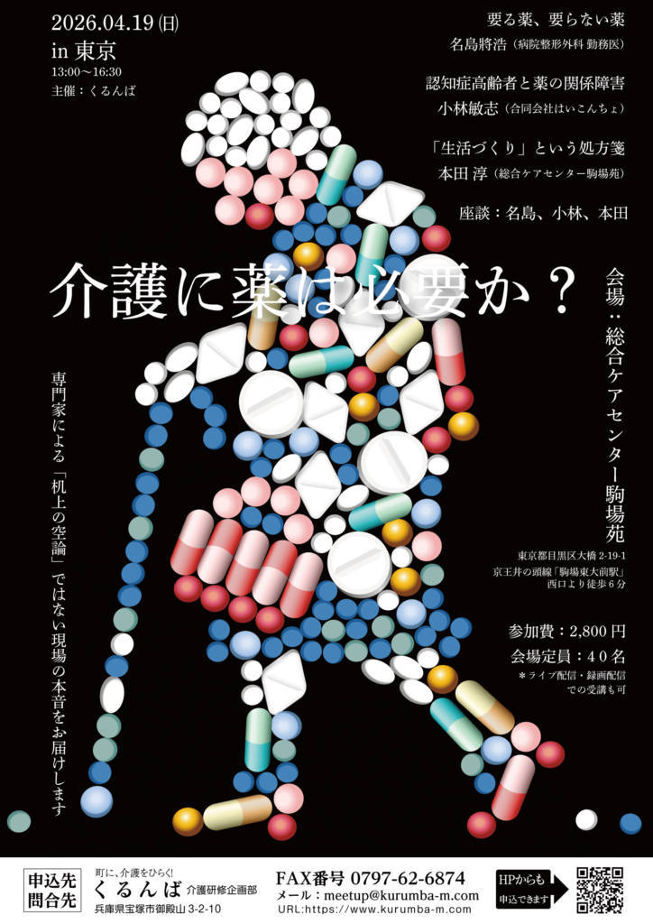 【日 時】 2026年4月19日(日) 13:00~16:30 (受付12:30~) 【会 場】 総合ケアセンター駒場苑 定員40名 東京都目黒区大橋2-19-1 【アクセス】京王井の頭線 「駒場東大前駅」 西口より徒歩6分 【受講料】 一般参加者2,800円(税込) 【講 師】 名島將浩(病院整形外科 勤務医)/小林敏志(合同会社はいこんちょ)/本田 淳(総合ケアセンター駒場苑) 【主 催】 くるんば 【申込先】 くるんば 【ライブ配信】zoomを利用します。お支払い後、パスコードをお知らせいたします。 ※WiFi環境などの視聴環境はお客様ご自身でご準備ください。 【録画配信受講】視聴期間:2026年5月4日〜3か月 *2026年5月4日以降のお申込みの方の視聴期間は入金確認後より3か月となります。 *録画配信は内容(著作権や個人情報など)によって、カットされる箇所が出ることもあります。 あらかじめご了承ください。 *動画は視聴しやすいよう数コマに分かれています。 *録画配信ですのでスマホ・タブレット・PCで、観たい時、いつでもどこでも何度でも気軽に視聴できます! *会場受講の方も後日録画配信を視聴できます。